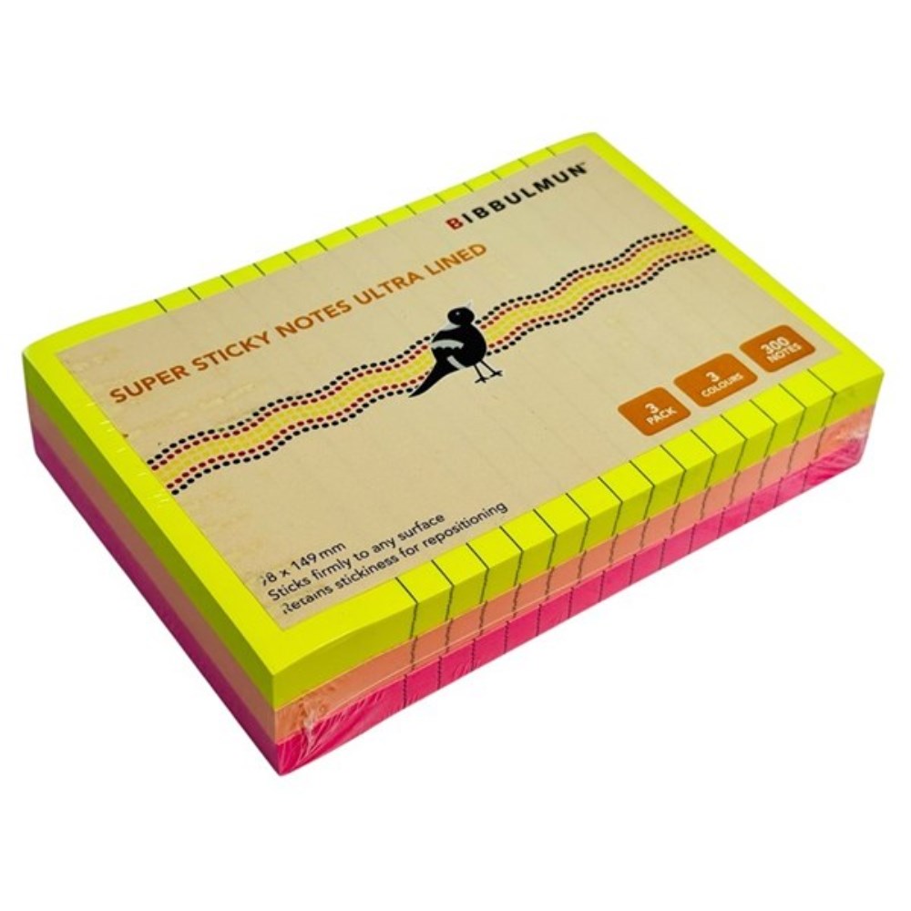 Bibbulmun Ultra Lined Super Sticky Notes 98 x 149mm Neon Assorted Pack Of 3