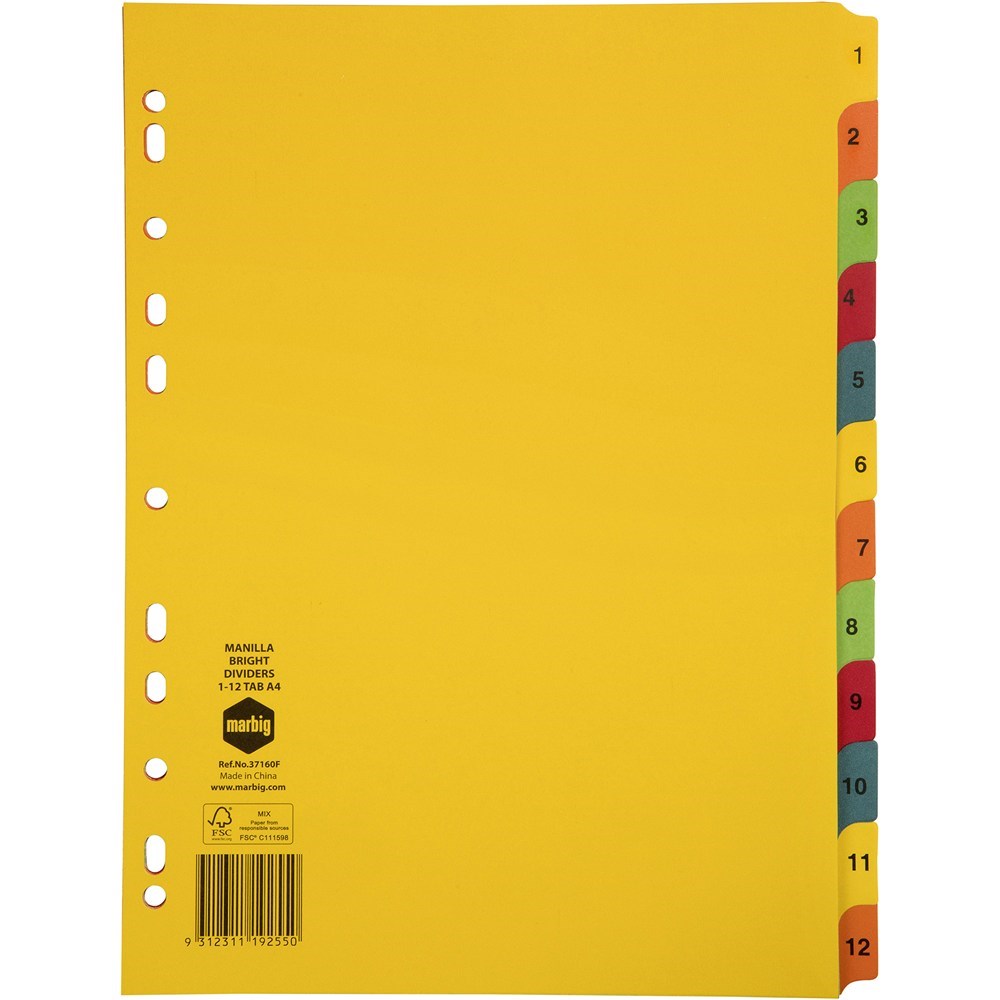 Marbig Manilla Indices & Dividers A4 1-12 Tab Bright Colours
