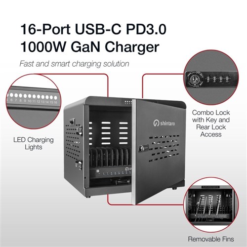 • A secure, high-powered solution for classrooms, offices and shared spaces. 16 USB-C PD ports delivering 1000W, it charges up to 10 notebooks at 100W or 16 devices at 60W.