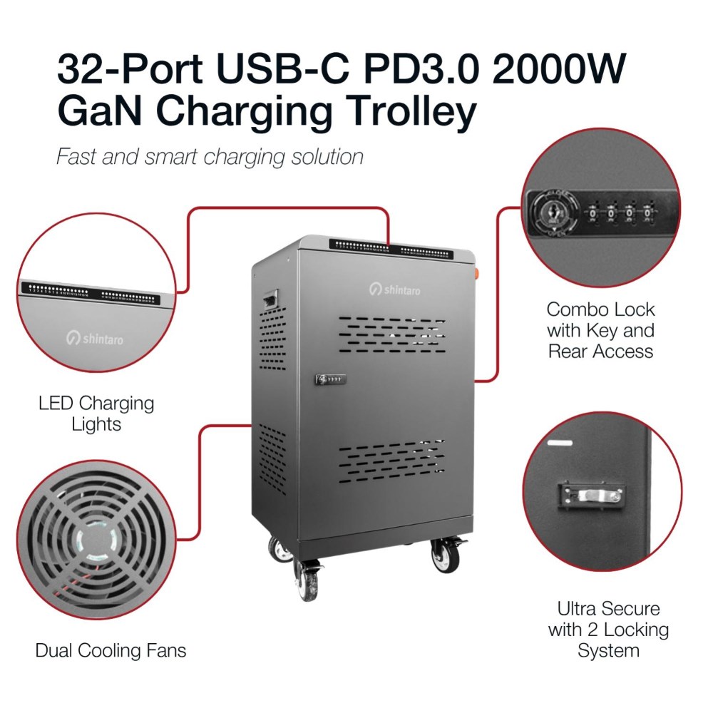 Shintaro 32 Port Charging Cart For Notebooks And Devices USB-C 2000W Black