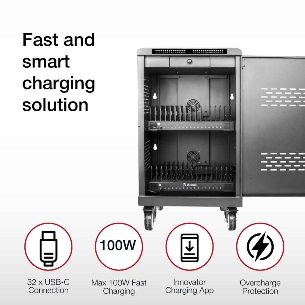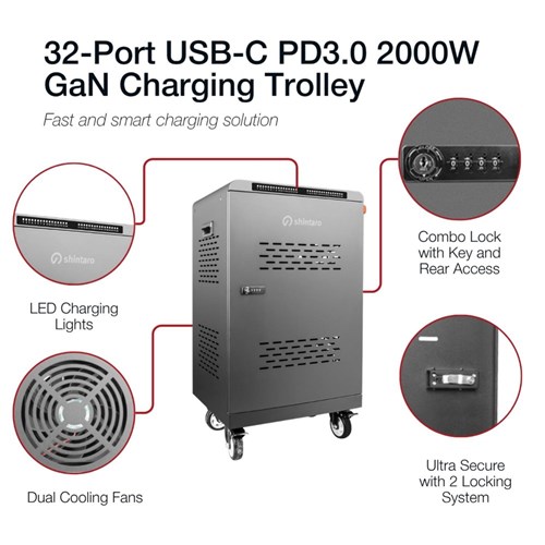 • A secure, high-powered solution for classrooms, offices and shared spaces. 32 USB-C PD ports delivering 2000W, it charges up to 32 notebooks at 100W or 16 devices at 60W simultaneously.