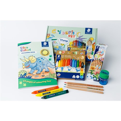 • Includes 64 page colouring book, 12 Natural Jumbo Triangular Coloured Pencils, 12 Noris Jumbo Triangular Wax Crayons and 1 Piece Double Hole Tub Sharpener.