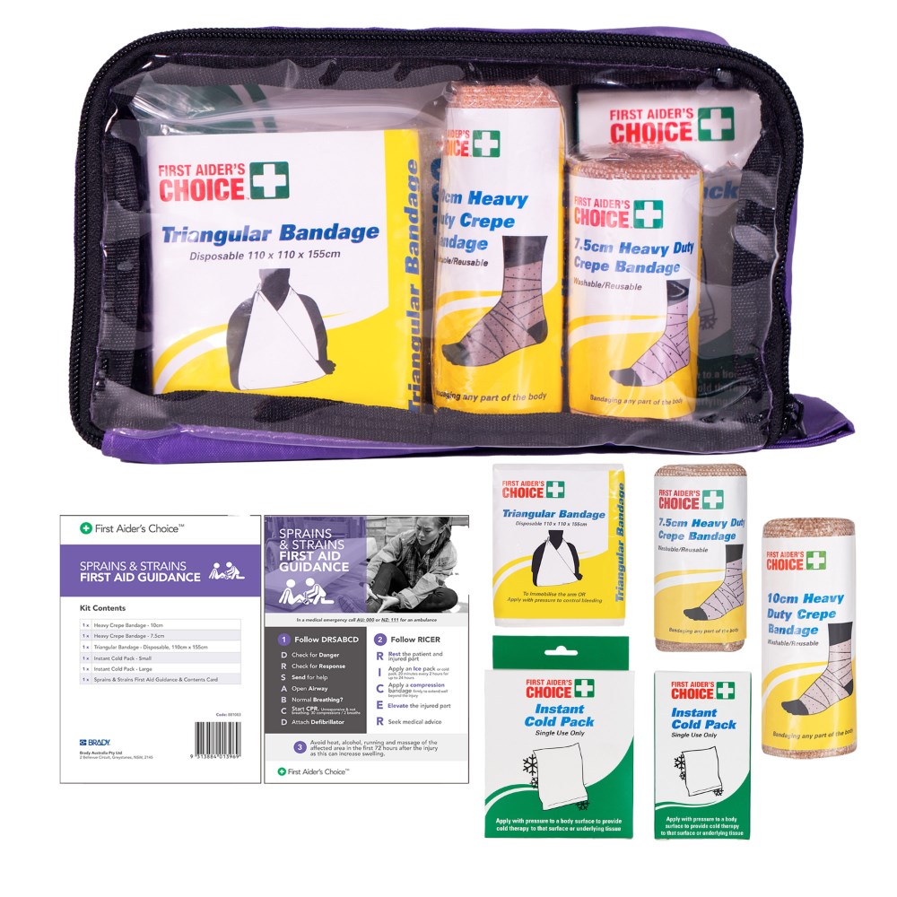• Contents: 1x Bandage Heavy Crepe 10cm x 2m, 1x Bandage Heavy Crepe 7.5cm x 2m, 1x Bandage Triangular 110cm x 155cm, 1x Large and 1x Small ice pack and Guidance and Content Card.