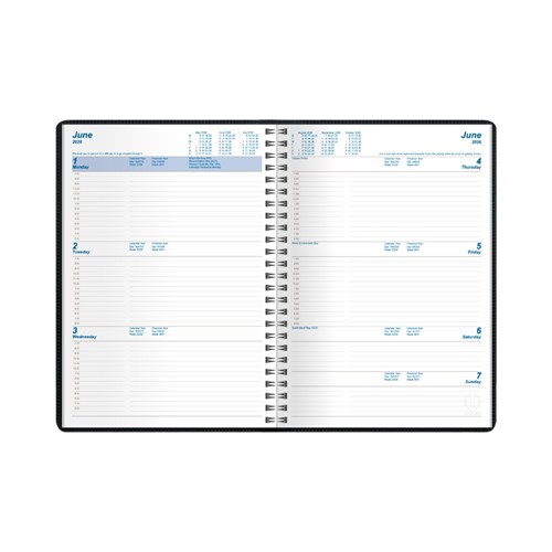 • Featuring a padded, phthalate free, PVC cover, pockets for storing business cards and wire-o binding to allow the diary to lie completely flat when open.