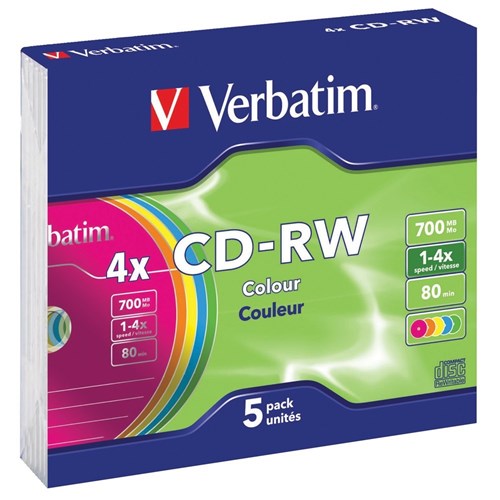 Verbatim Recordable CD-RW 80Min 700MB 2-4X Slim Case Assorted Colours Pack Of 5