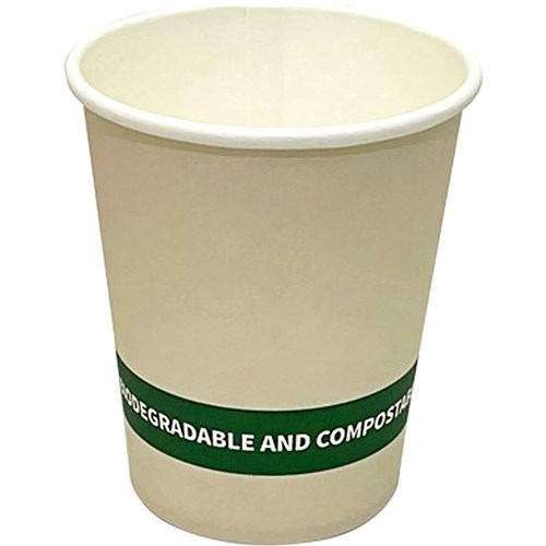 • 8oz (237mls) capacity, single-walled cups with a polylactic (PLA) bio-lining and 80mm diameter.
