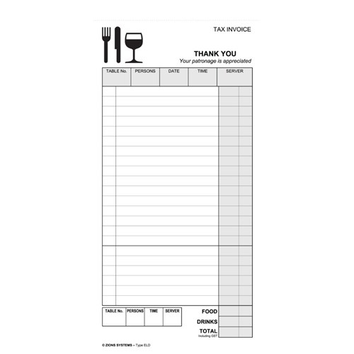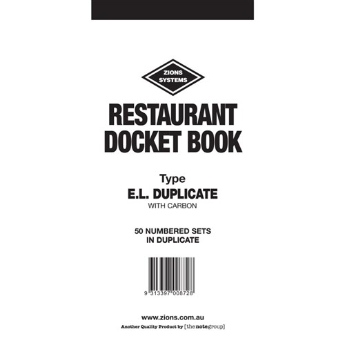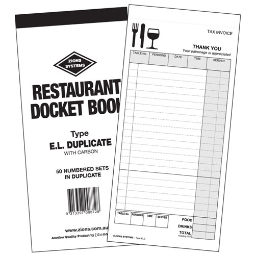 • Zions offers a wide range of single, duplicate, triplicate and quadruplicate restaurant docket books, suitable for all styles of bistros, cafes, restaurants and take-away outlets.